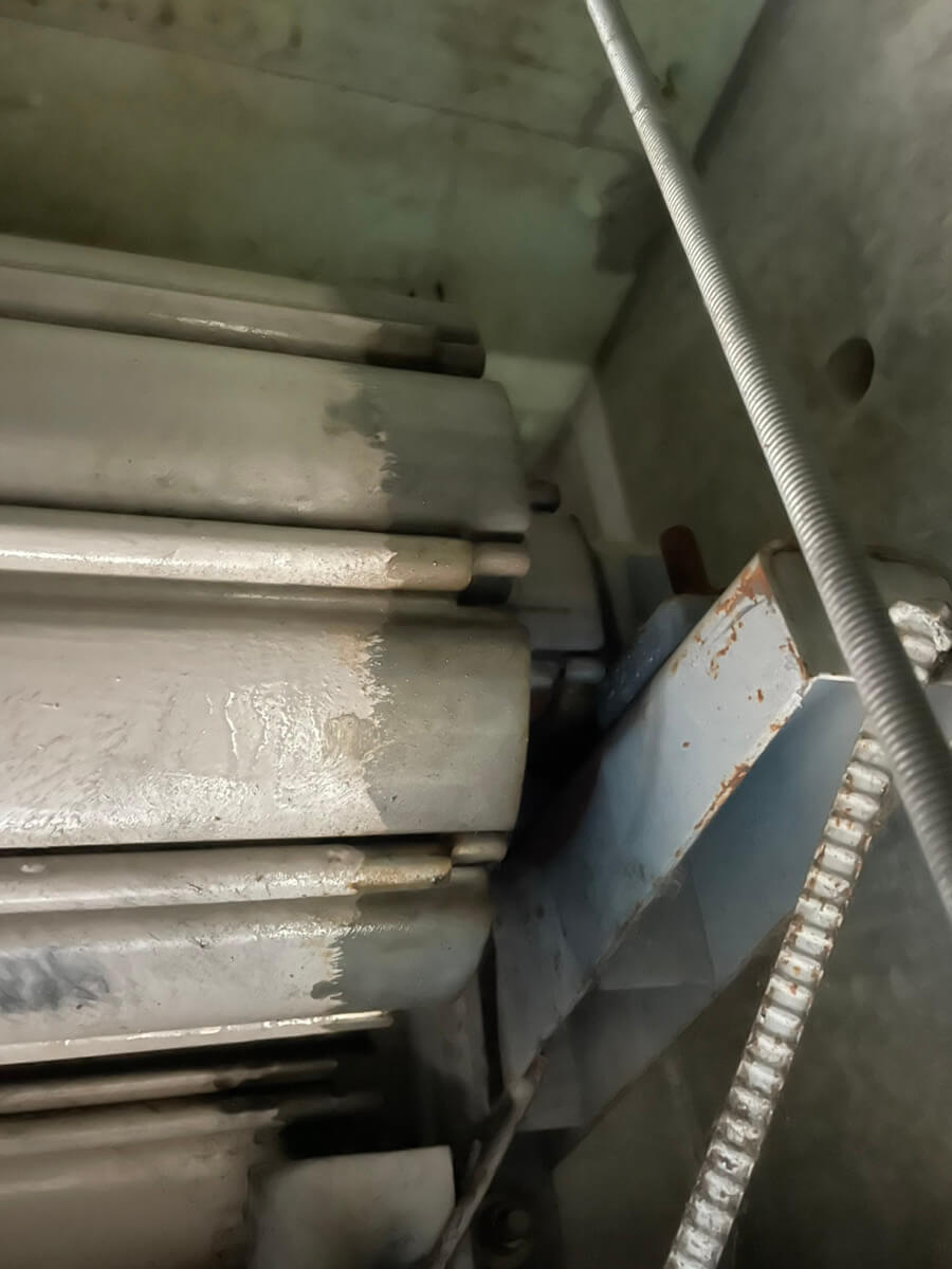 画像ではわかりにくいかもしれませんが、シャッターの表面部分であるスラットがお風呂の蓋をくるくる巻いてないしていく時にズレてしまったようで、そのズレが引っ掛かりを引き起こし、動かなくなってしまっていました。