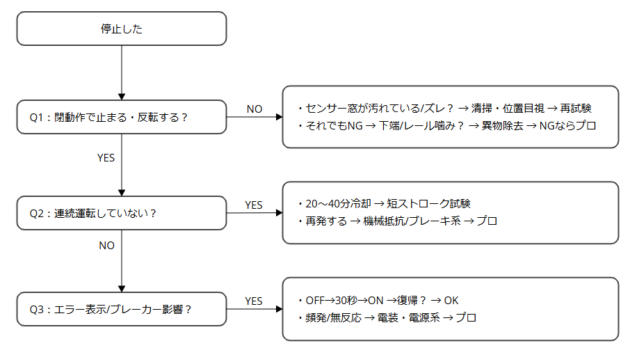 - 再試験は“人がいない状態”で:短ストロークで上→下を各1回。異音・引っ掛かりが続くなら中止。